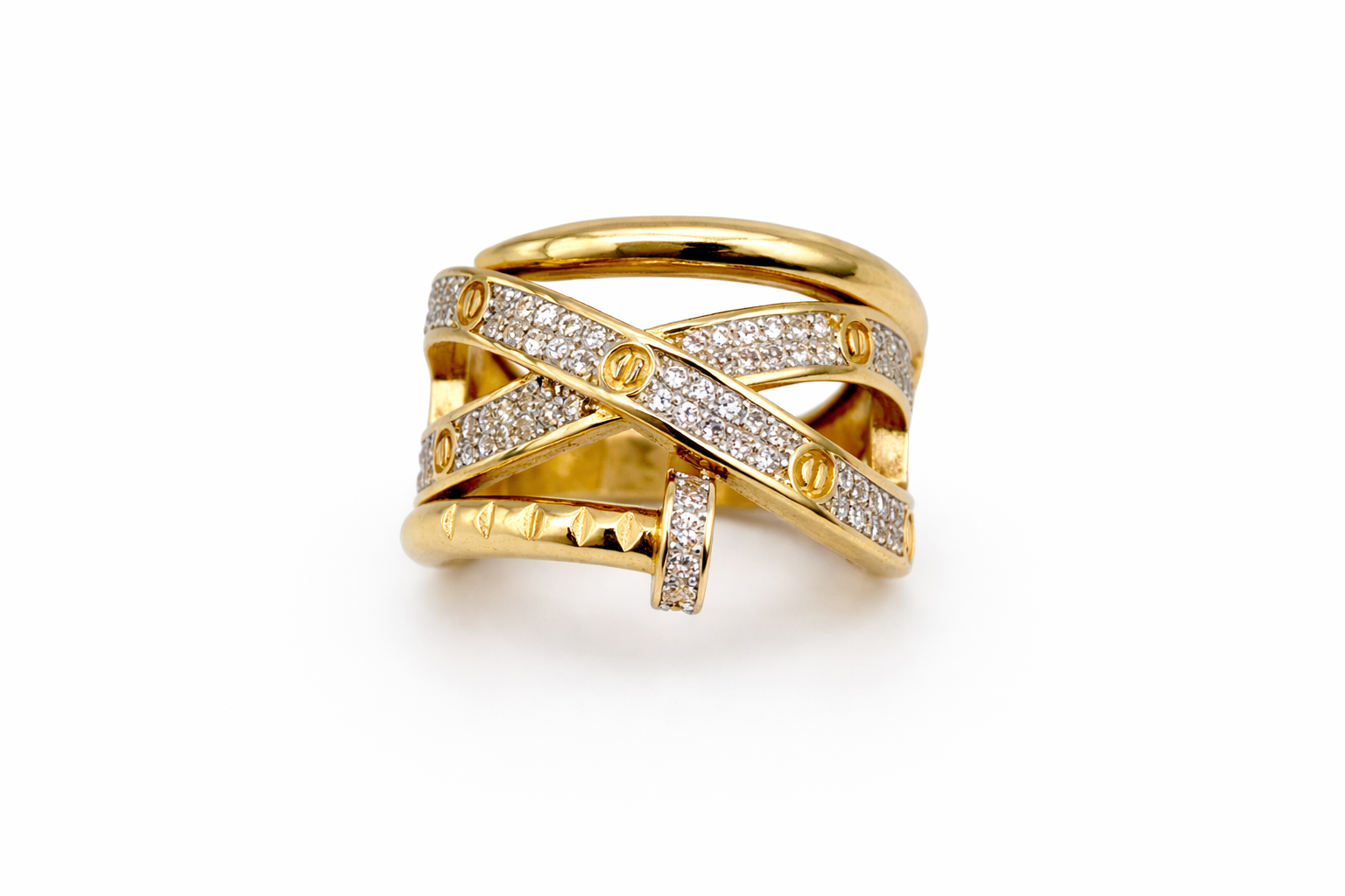 - Diseño cruzado: bandas entrelazadas que abrazan el dedo con sofisticación.